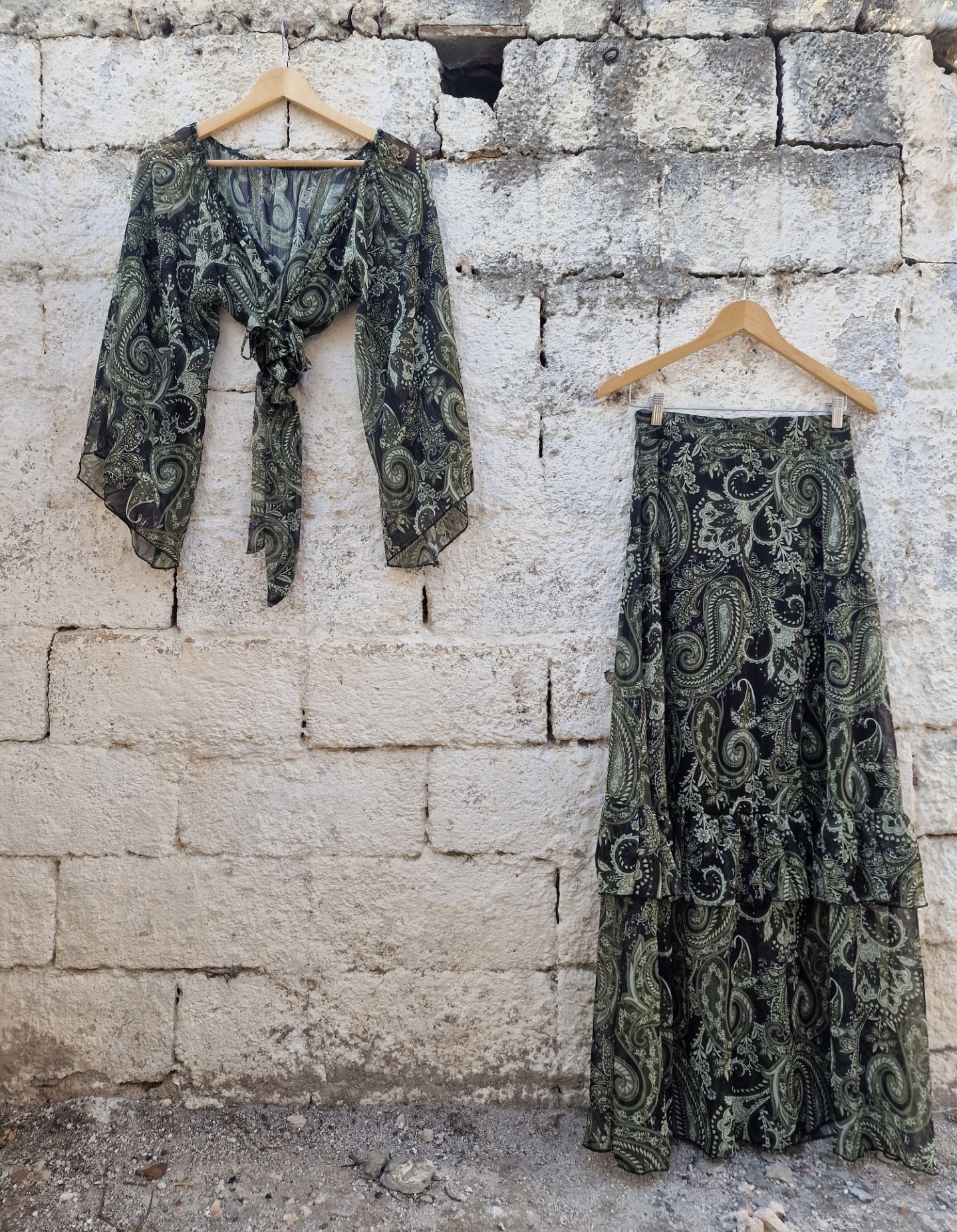 One size σετ με μοτίβο λαχούρι. Αποτελείται από Φούστα με εσωτερική φόδρα και λάστιχο στην μέση και πολυμορφικό τοπ με ρυθμιζόμενο δέσιμο.