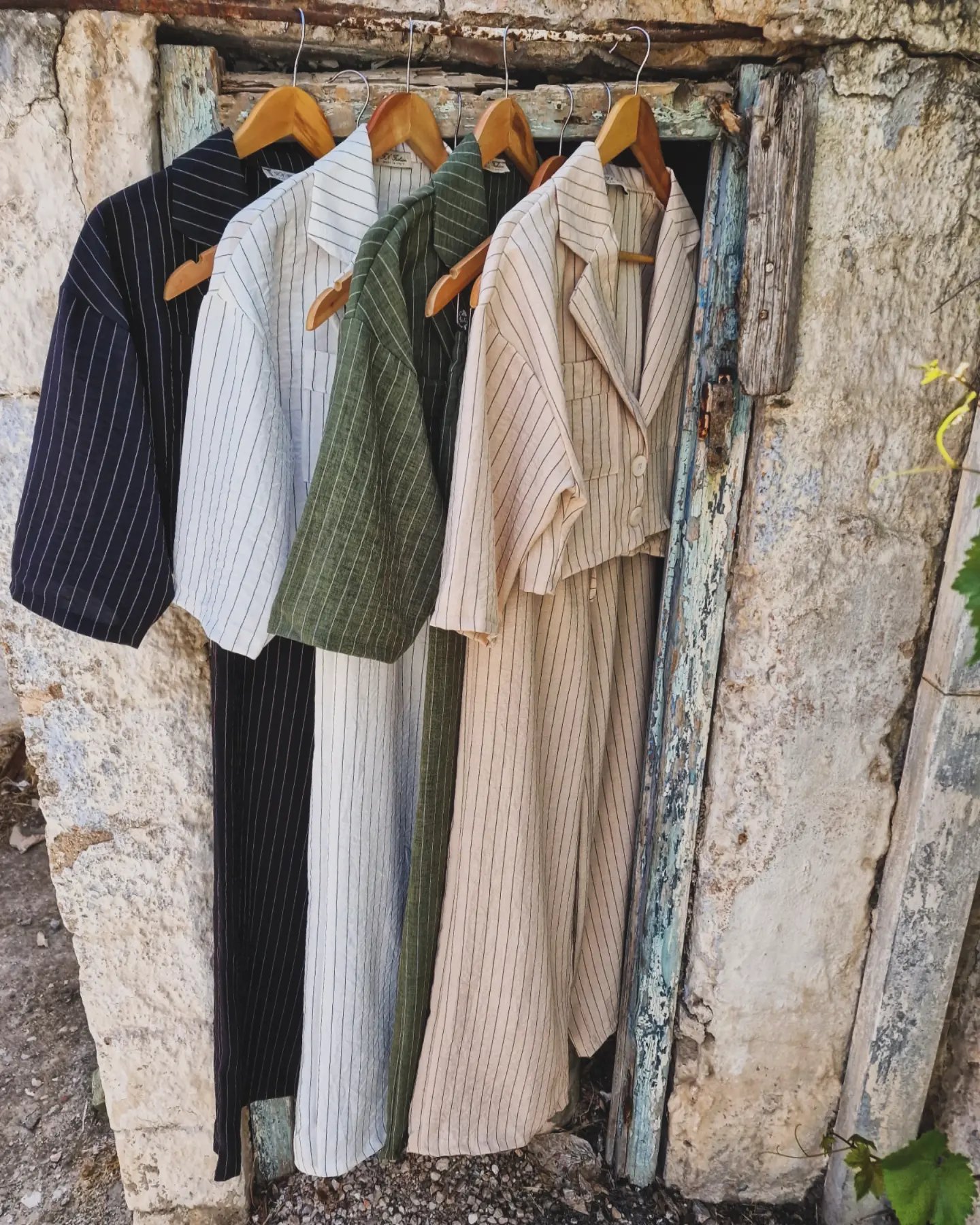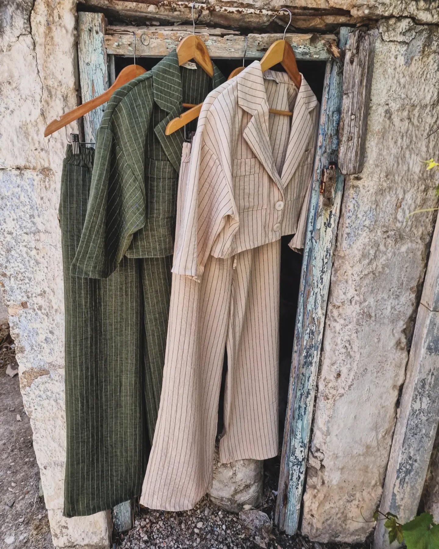 Ριγέ σετ με παντελόνα σε άνετη γραμμή και cropped πουκάμισο με τσέπες στο στήθος με μανίκια 3/4.