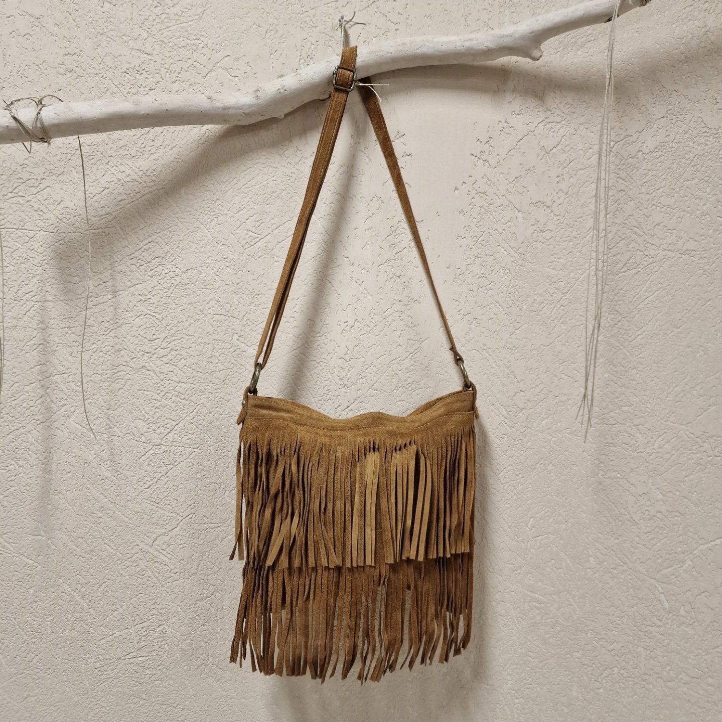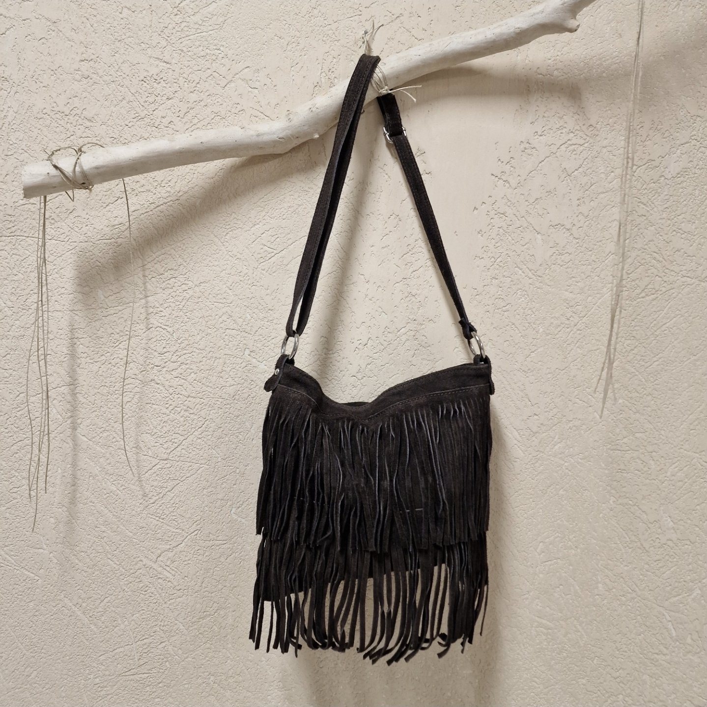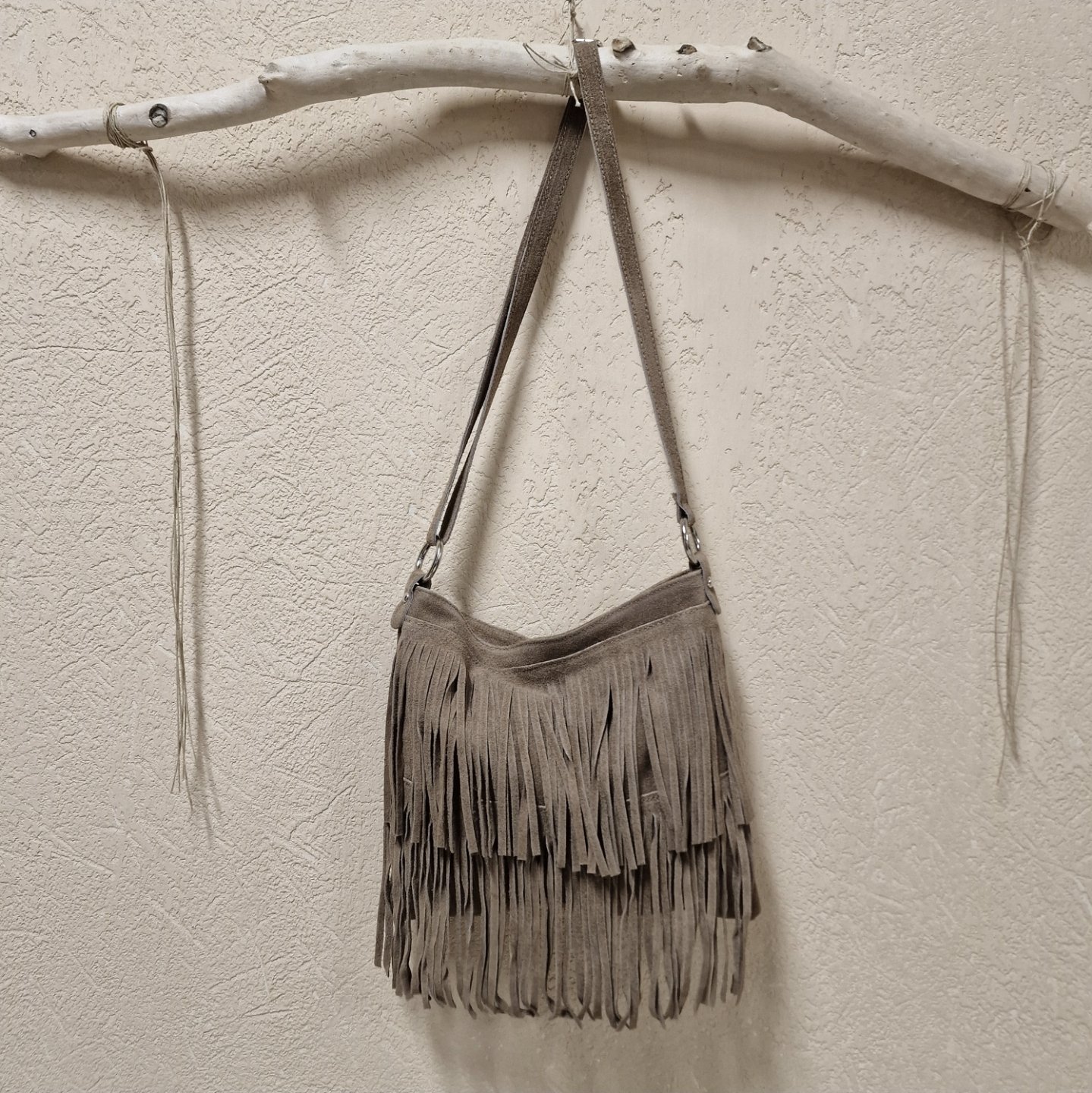 Σουέντ τσάντα με λεπτόμερειες από κρόσσια και ρυθμιζόμενο λουράκι, κλείνει με φερμουάρ.