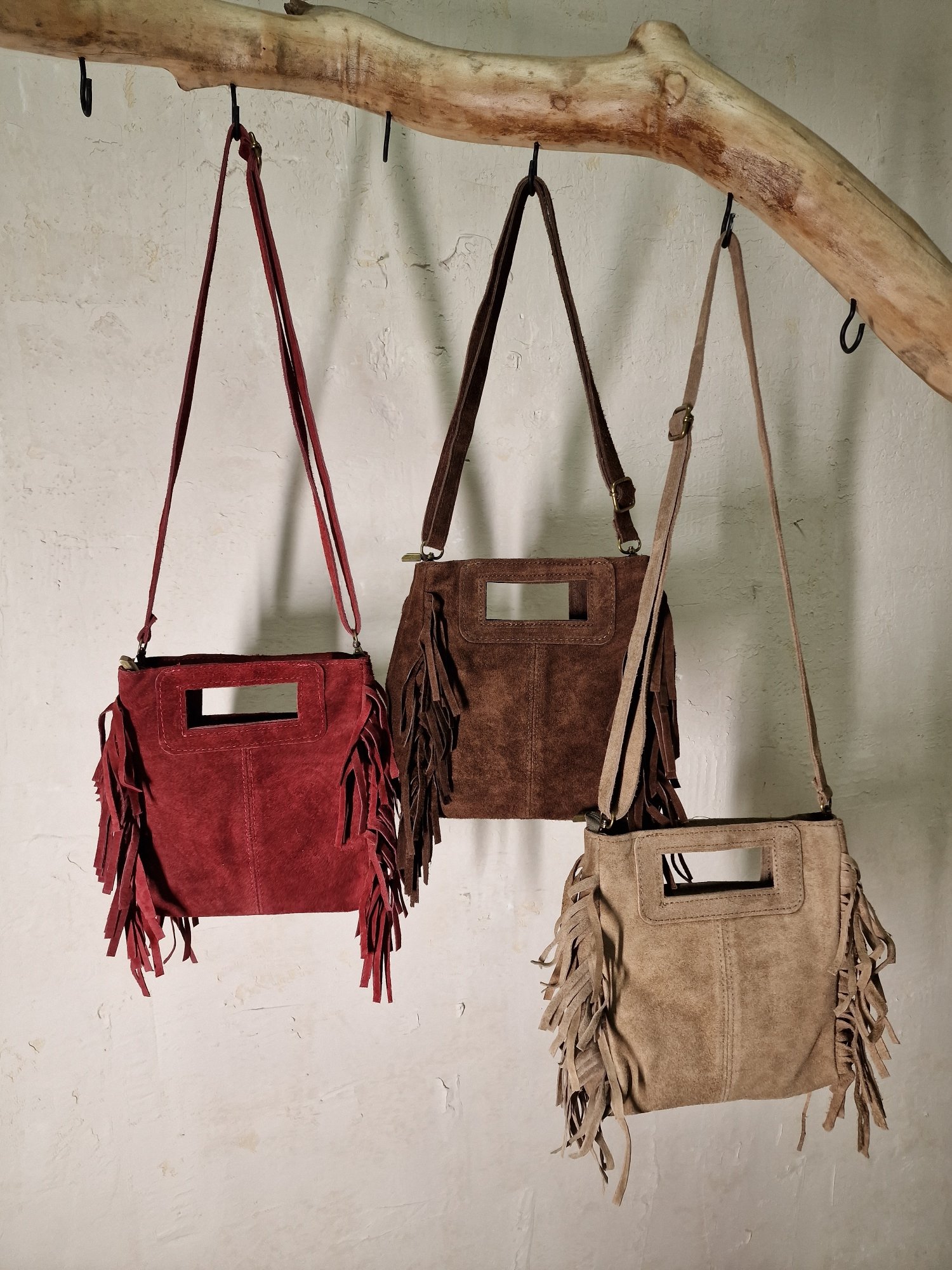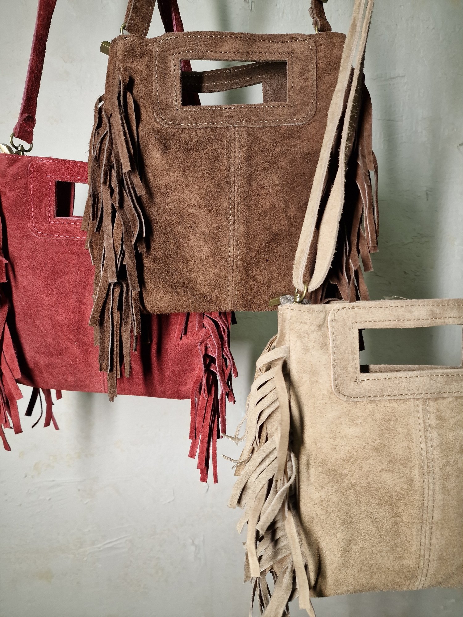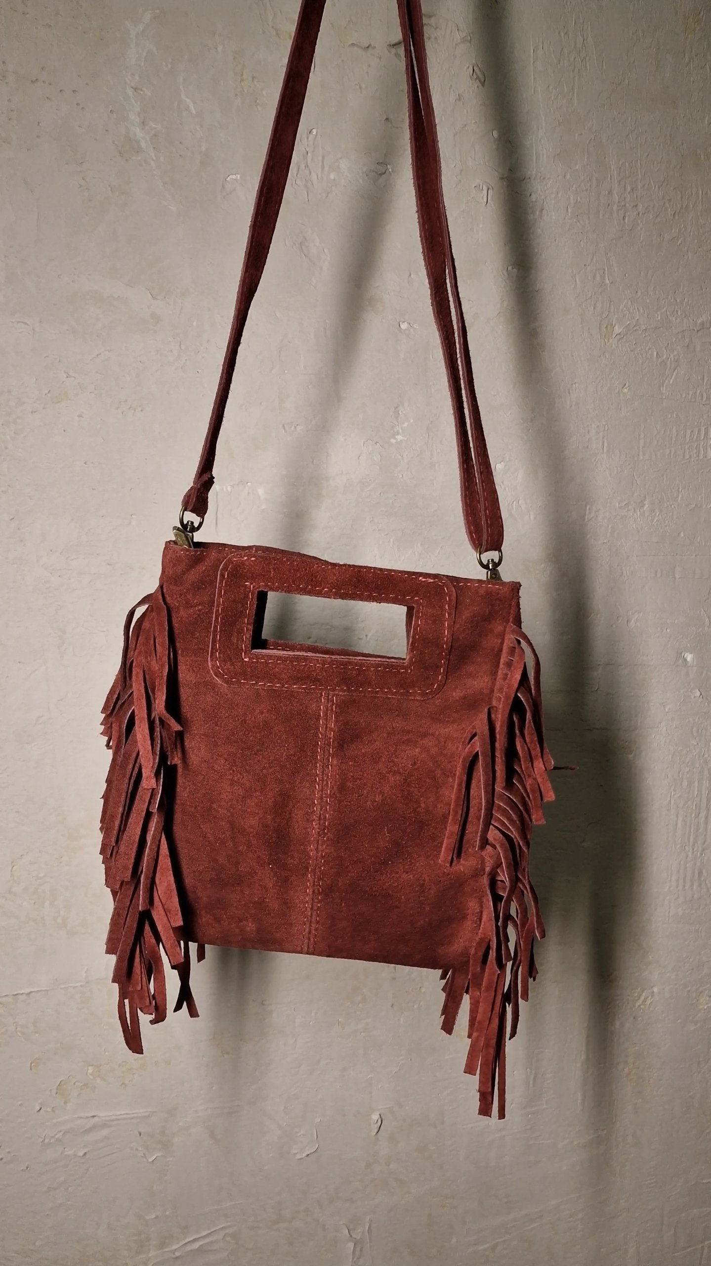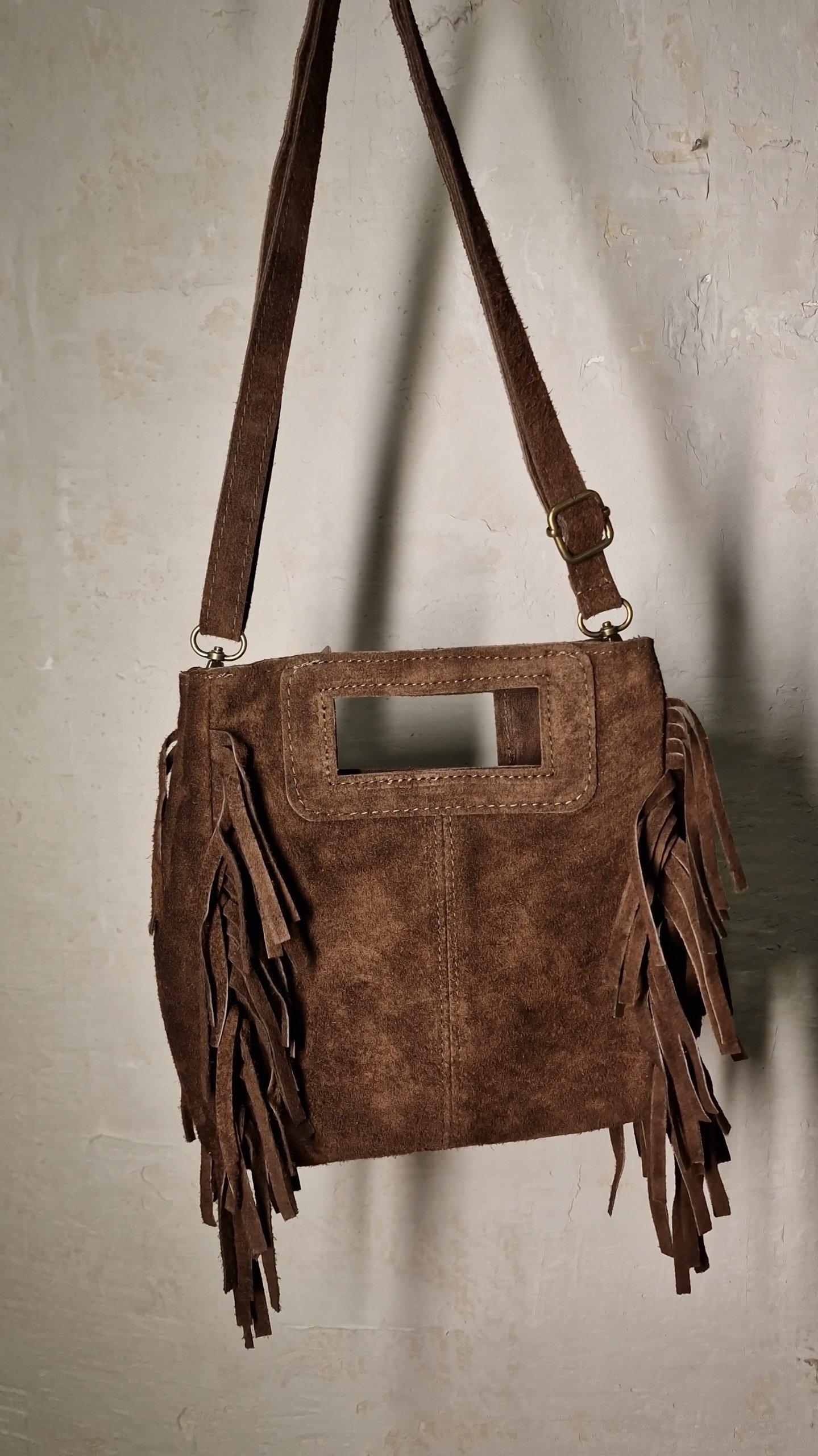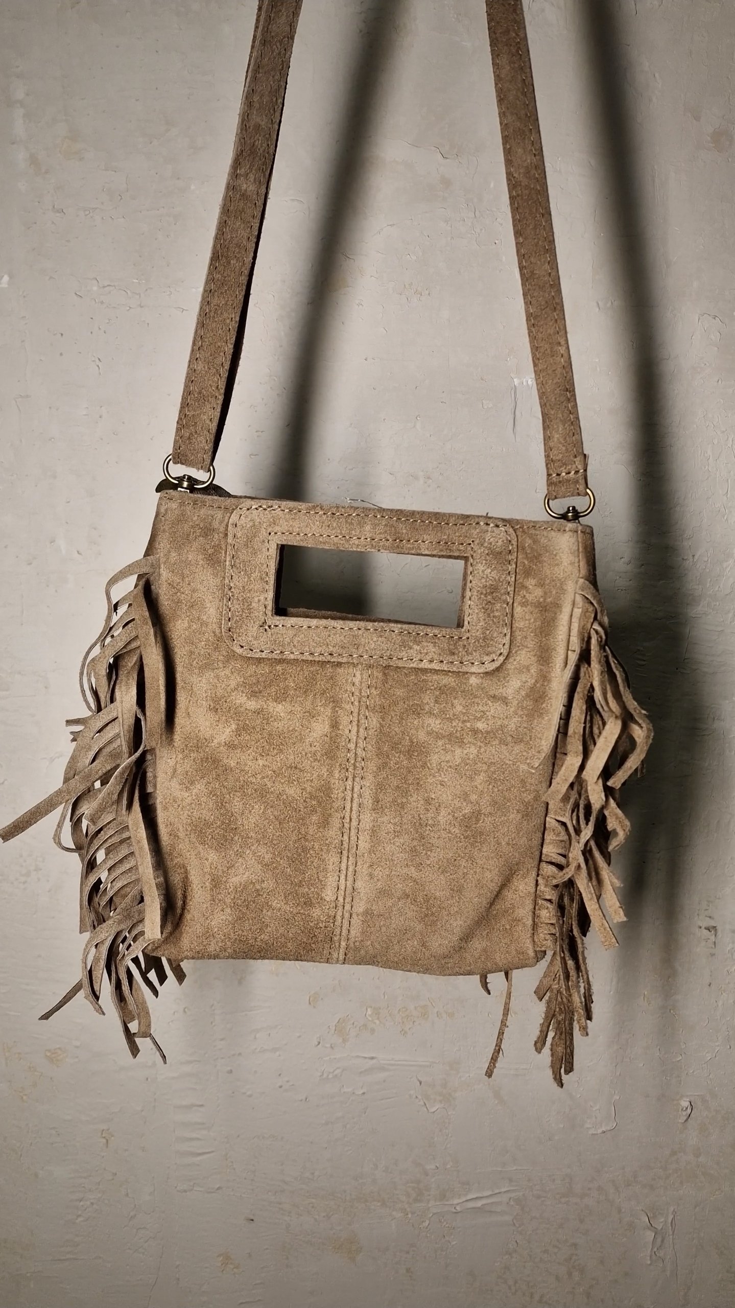 Tσάντα με λεπτομέρειες από κρόσσια και ρυθμιζόμενο λουράκι που κλείνει με φερμουάρ.