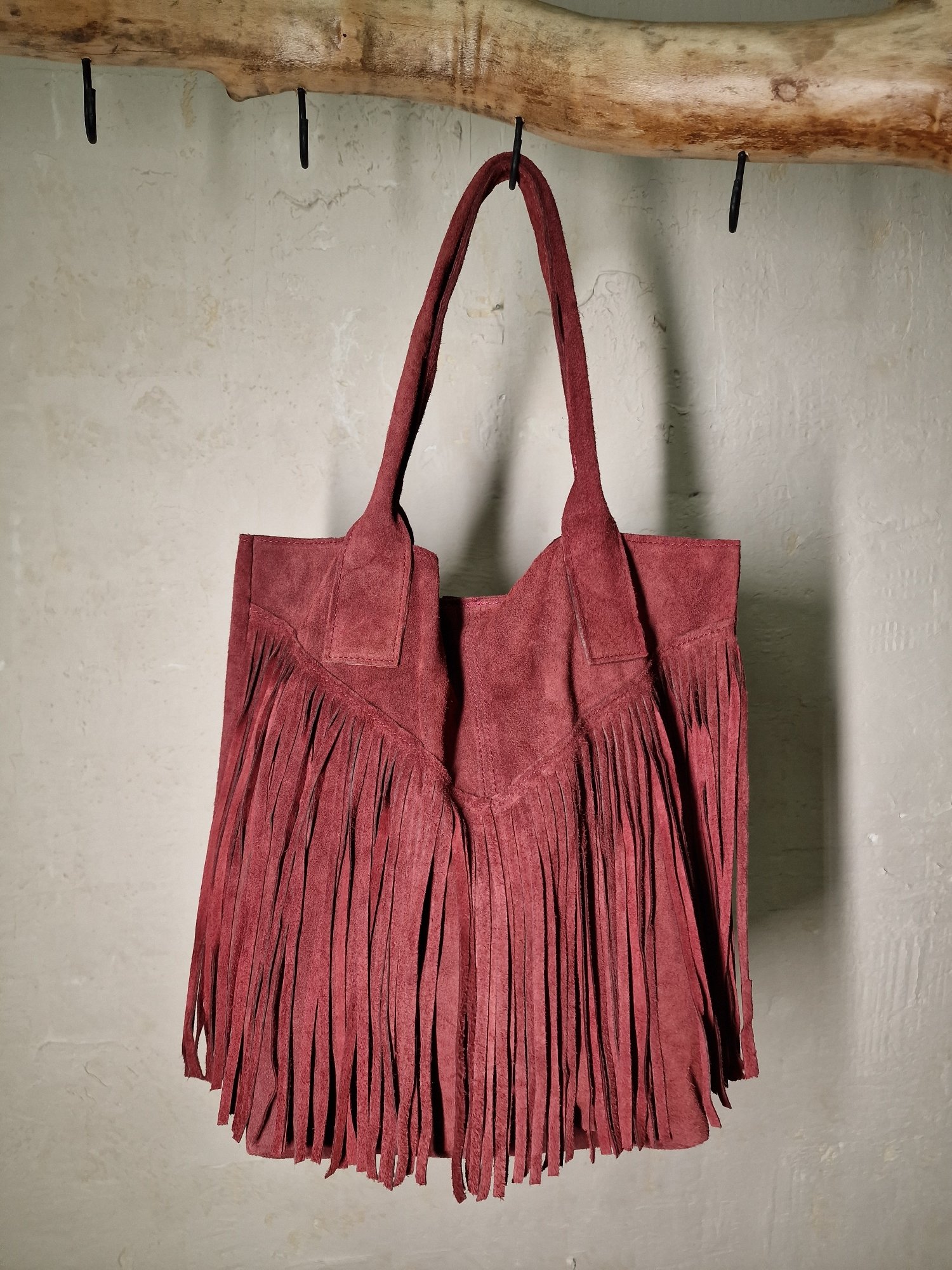 Τσάντα μεγάλη με λεπτομέρειες από κρόσσια και σταθερά λουράκια. Κλείνει με κουμπάκια.