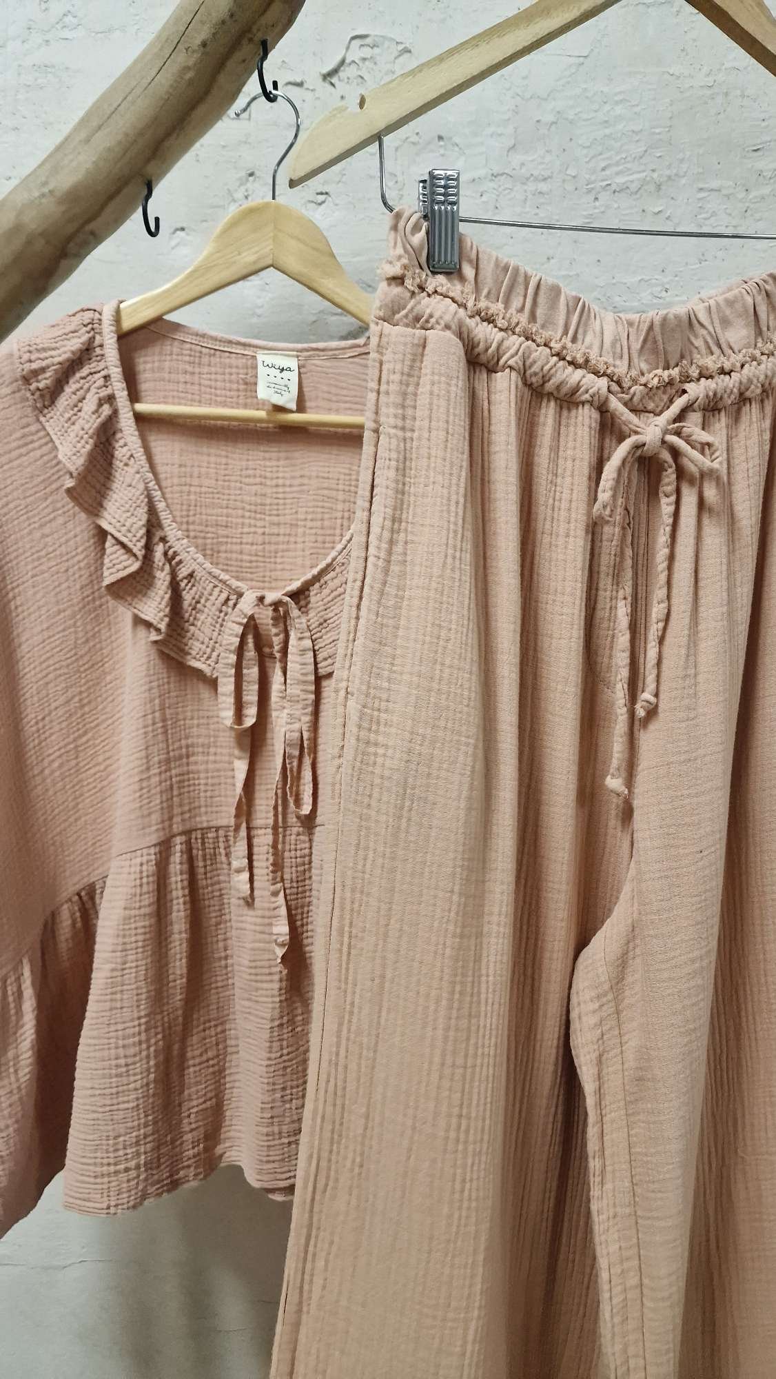 One size set με άνετη εφαρμογή. Αποτελείται από μπλούζα και παντελόνα με λάστιχο στην μέση και ρυθμιζόμενο κορδόνι.