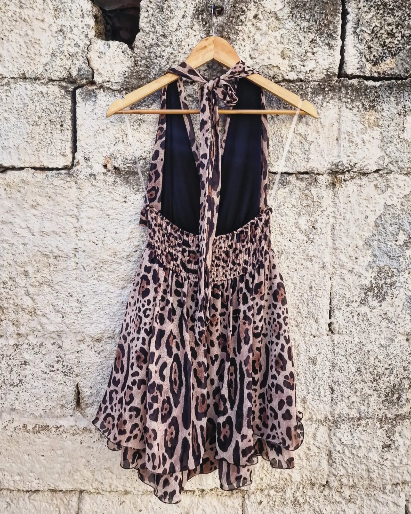 Elyana leopard mini φόρεμα με εσωτερική φόδρα και δέσιμο πίσω από το λαιμό.