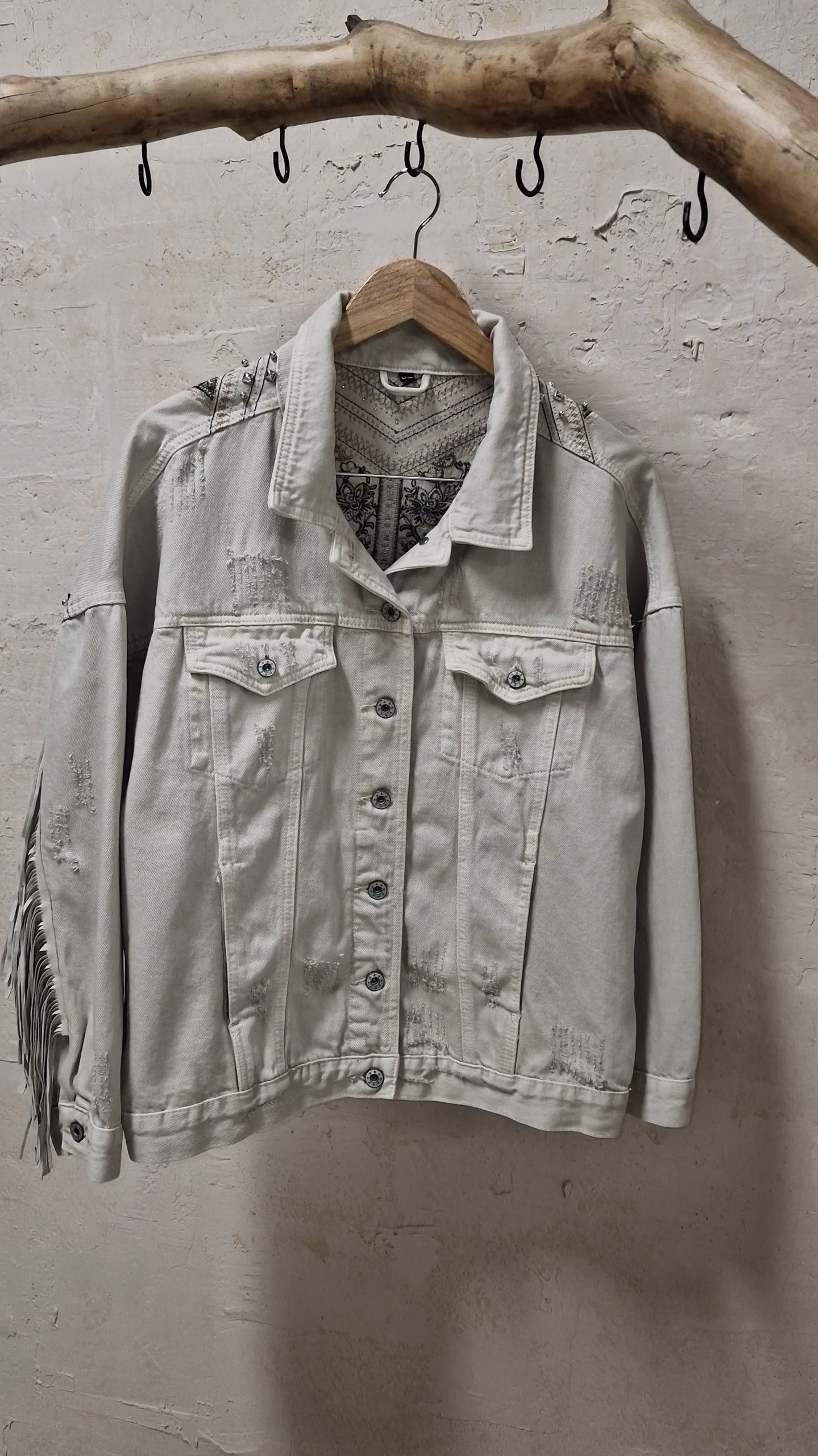 Jean jacket με λεπτομέριες από κρόσσια και κεντήματα.