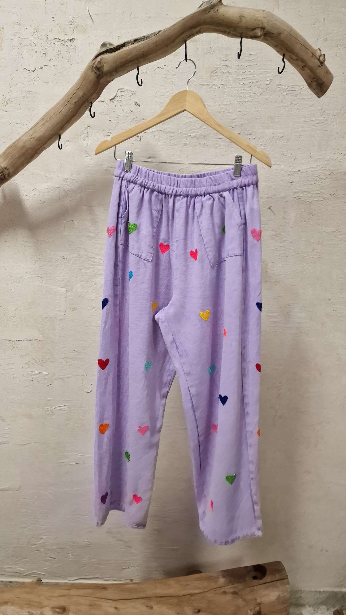 Βαμβακερό τζίν παντελόνι με άνετη εφαρμογή και λάστιχο στην μέση. Διαθέτει μοτίβο με κεντητές καρδούλες και πλαινές τσέπες.